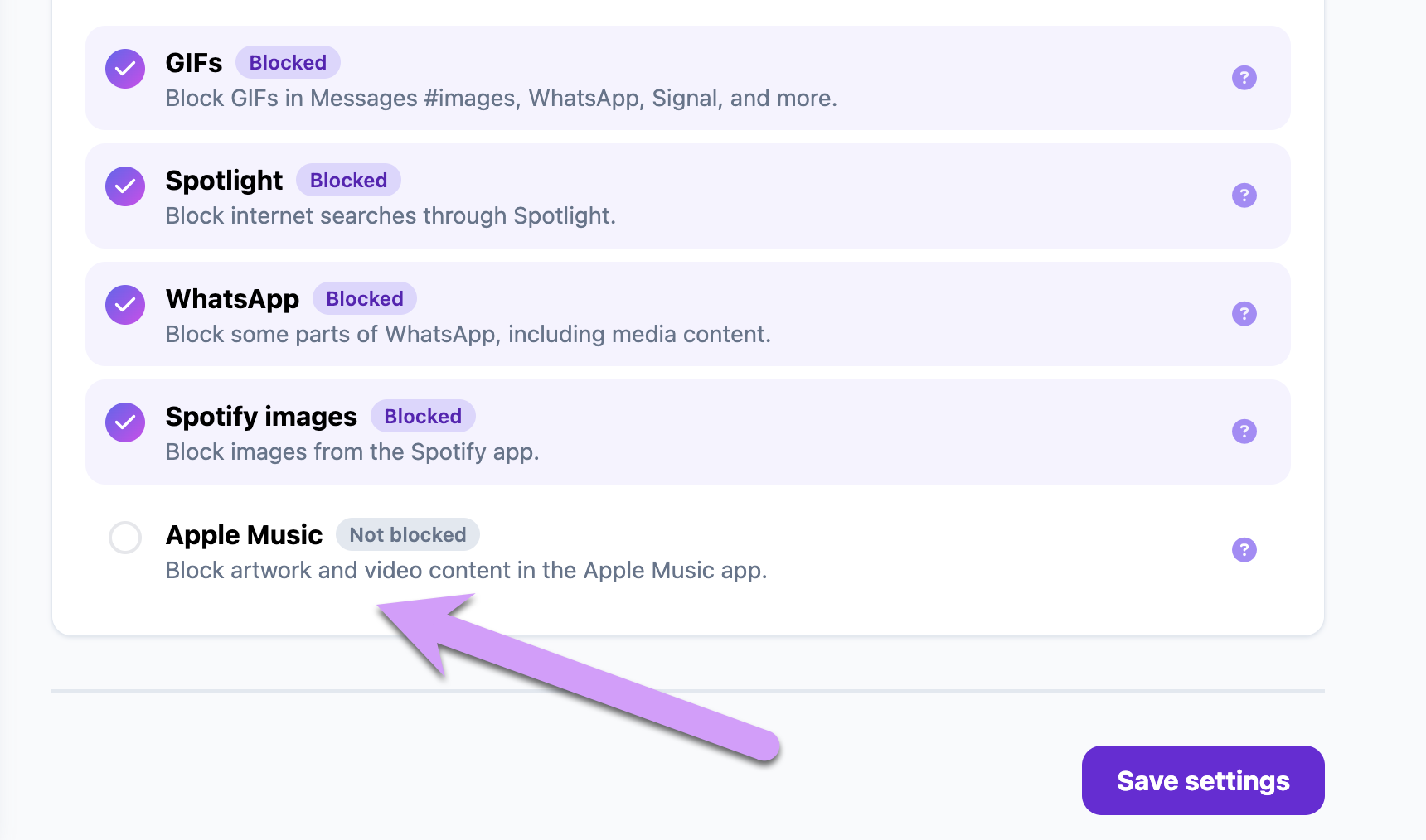 If you already have Gertrude installed, it's a little more involved. Because we don't want to silently change behavior for families that are already relying on the app, new block groups are opt-in for existing users—the Apple Music group won't turn on automatically when you update.