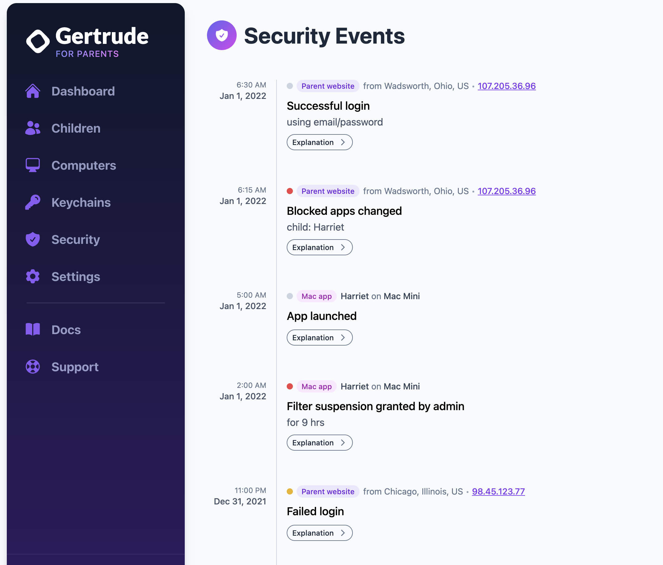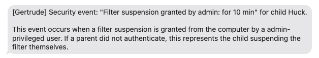 A "security event" is anything that happens in the Gertrude Mac app or parents' website that could affect the safety of your child's device — things like filter suspensions, password resets, changes to monitoring settings, or login attempts. Most of the time these are perfectly normal actions taken by you, the parent. But if you weren't the one who did it, you'd want to know.