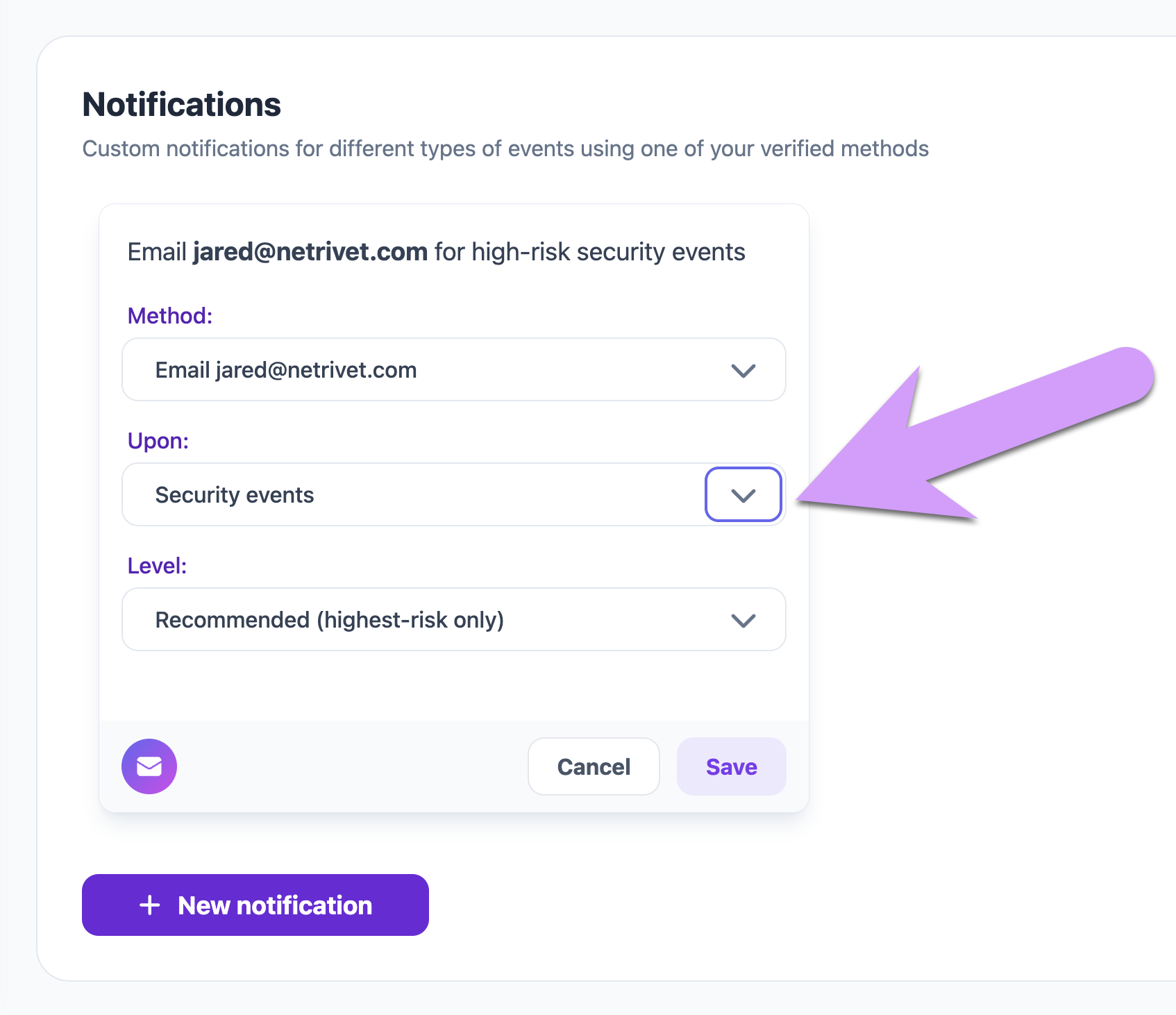 Head to your notification settings and add a new notification with the Security events trigger. You can be notified by email, text, or Slack — so you'll know right away if something happens, without having to remember to check. If you have a tech-savvy child who might try to work around their protections, these notifications give you peace of mind that you'll know about it.